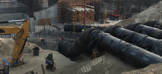 The lift station will pump an average daily flow of 3.0 MGD dry weather flow and will have the ability for future phased expansions for up to 6.6 MGD of average flow. The lift station includes a 55 foot deep wet well requiring approximately 11,000 LF of sheet pile shoring, drilled concrete piers, dewatering, thermal monitoring of mass concrete, installation of 4 Vertical Non-Clog Centrifugal Pumps and pre-engineered odor control system. The sewer lift station work also includes the demolition of the Interim Summerly Lift Station and the Back Basin Groundwater Filtration Plant Lift Station and downsizing of the B-1 Lift Station. The dual force mains work includes approximately 3,400 linear feet of 18-inch and 26-inch HDPE fused pipe,102 linear feet of jack and bore in Lakeshore Drive and 686 linear feet of micro-tunneling a 66-inch diameter casing across the San Jacinto River.